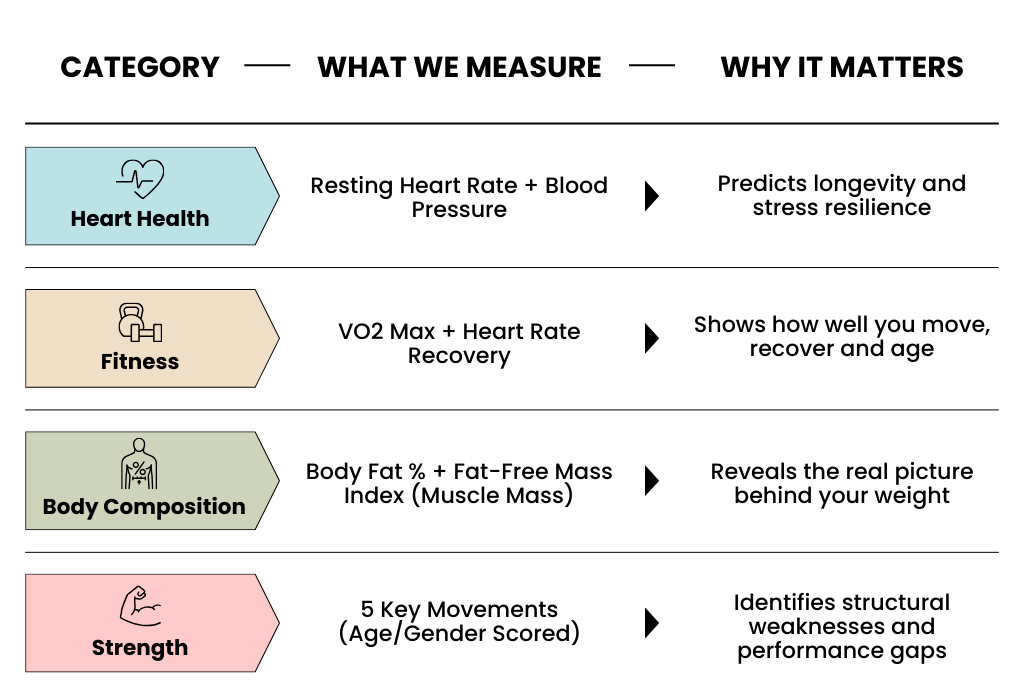 Before you invest another minute in fitness, you need to know exactly what's holding you back. Our comprehensive 4-part assessment creates your personalised Health Score - the critical baseline that reveals:
